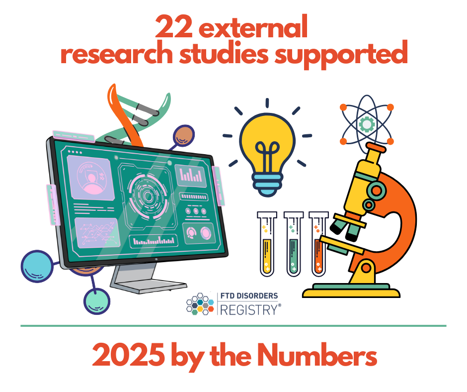 In 2025, the FTD Disorders Registry supported 22 external research studies, helping connect researchers with participants who are interested in contributing to scientific discovery. By serving as a bridge between the research community and people affected by FTD, the Registry plays a key role in reducing barriers to participation and accelerating study timelines.